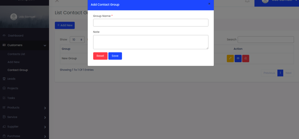 Select Customers > Contact Group > Add New, Input Details and click Save