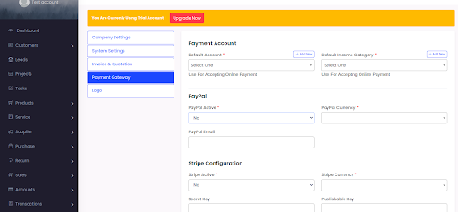 Select Settings > Company Settings > Payment Gateway
