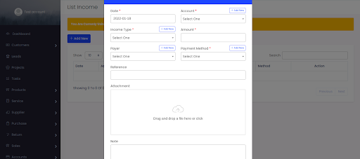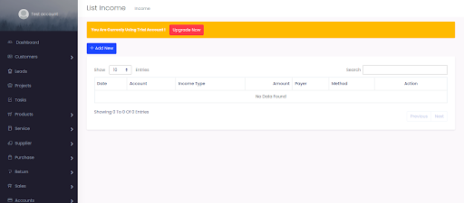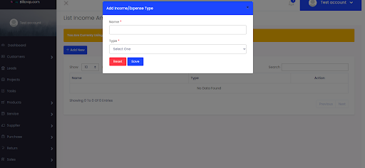 Select Settings > Income and expense type> Add New, fill the field and select account type and click Save.