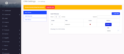 Select Settings > CRM Settings > Select Leads Status, select option to Add New leads or Select existing leads status to EDIT, VIEW OR DELETE.
