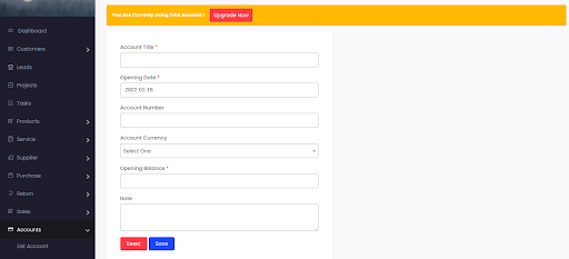 Select Accounts > List Account >Add New Input the fields correctly and click Save