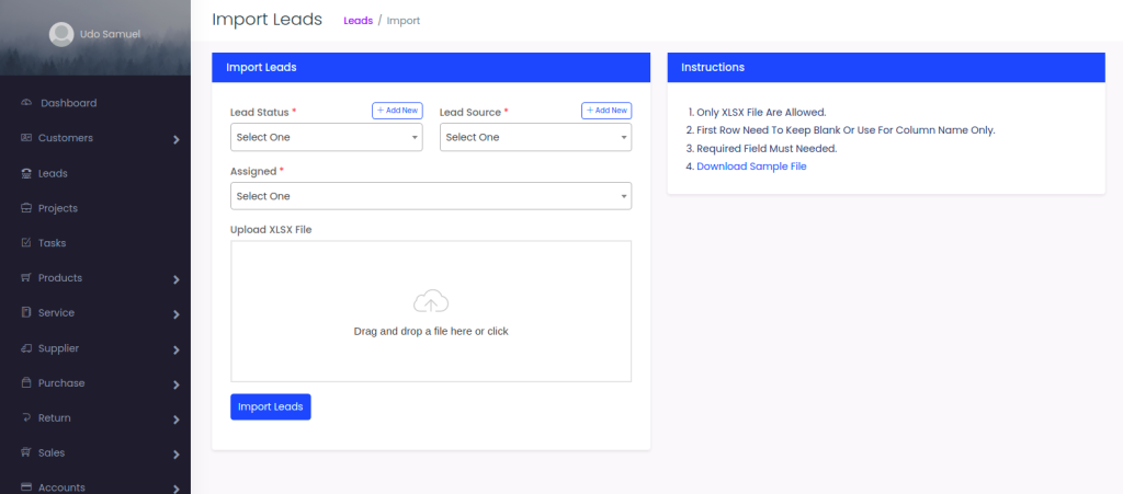 To Import Leads from spreadsheet .xlsx format: